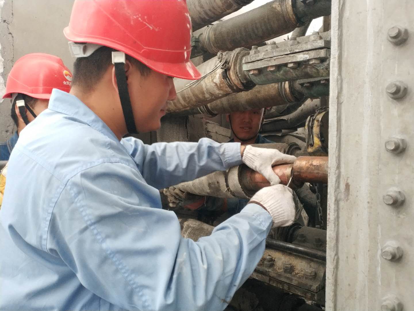 動力裝置員工正在檢修現(xiàn)場更換1#電石爐變壓器后方水冷補償器。