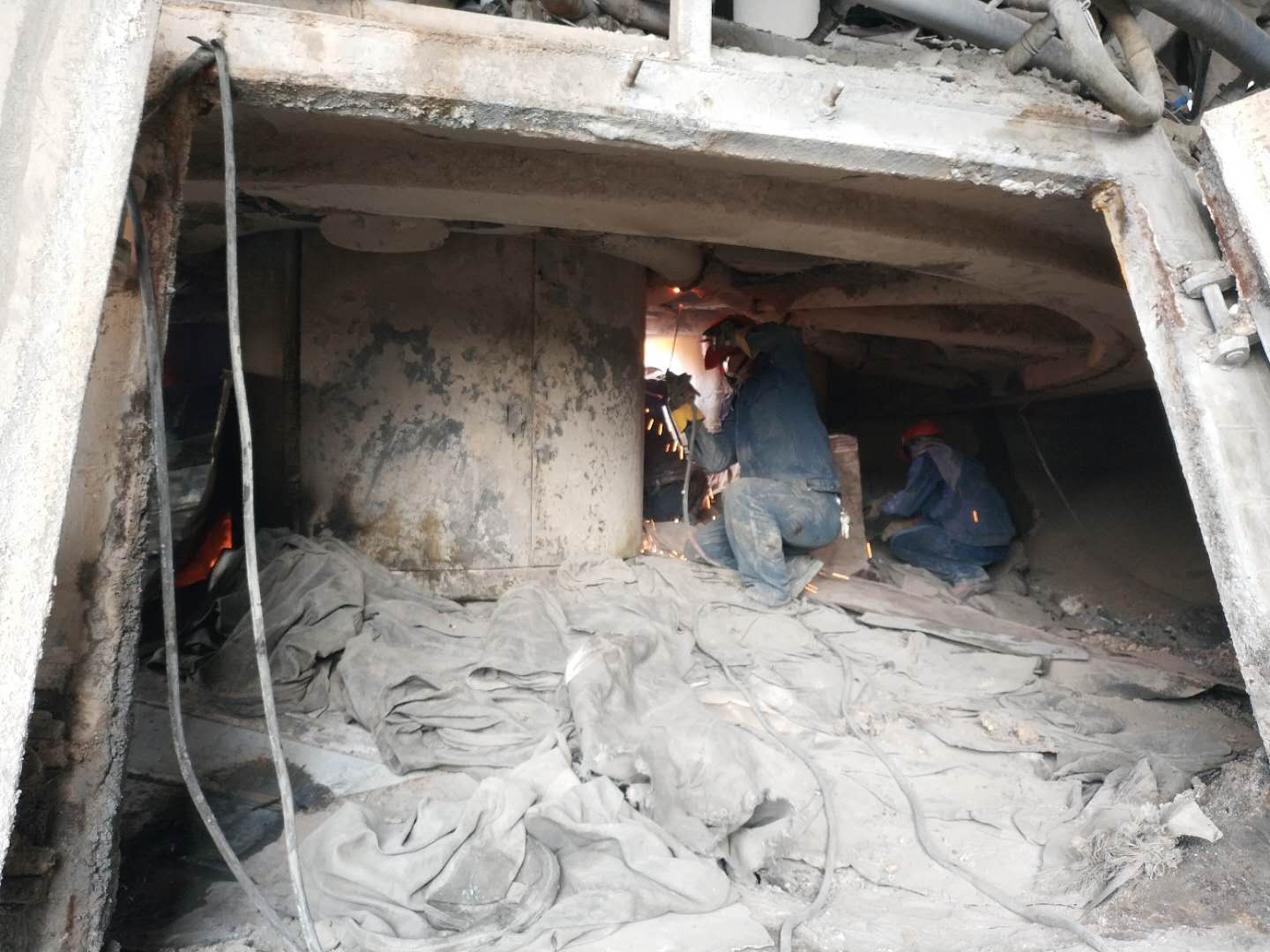 維修人員正頂著爐內高溫,對電極本體進行檢查,并修復爐內漏點。