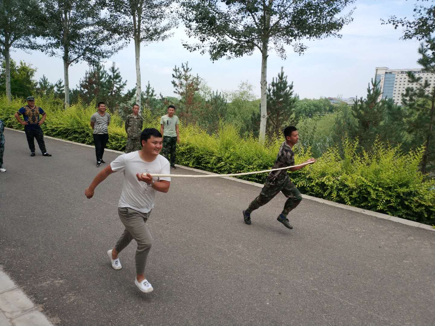 早上8點到黃河樓后,我們對18名新學員進行了分組,將隊員分成兩支隊伍,由隊長組織進行游戲。在隊長的帶領下,各隊隊員精誠合作,相互支持,先后進行了“跳繩比賽”、“個人跳繩比賽”、“斗牛比賽”“背對背運氣球比賽”“拔河比賽”、“俯臥撐比賽”等拓展項目。