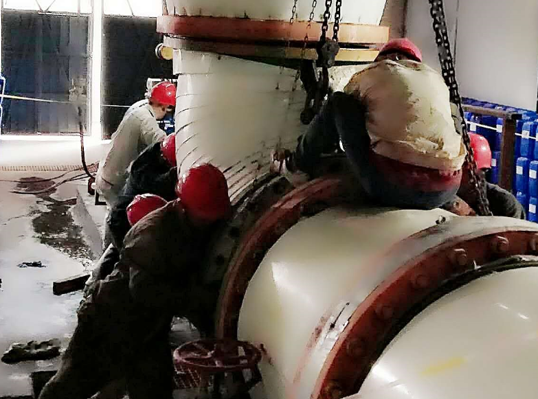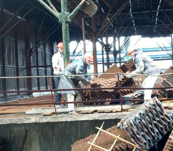 無論自身如何泥水相伴,冷卻塔上下的檢修人員你拆我接,你接我送,緊張有序、團結一致地進行著大面積的填料拆取、塔桿更換工作。