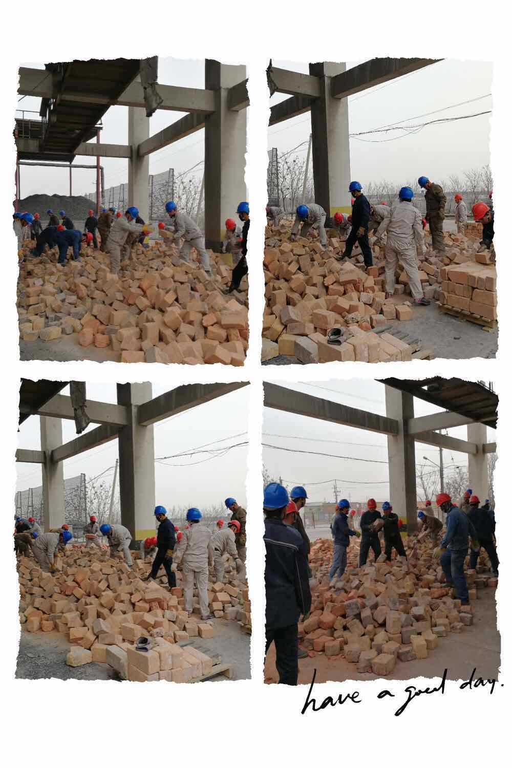 近幾天,公司領導帶領各裝置日勤人員,篩檢白灰窯拆除下來的能重復利用的舊耐火磚,大家齊心協力,沒有一句怨言,有的只是埋頭苦干,正是這樣一群可愛的人將美好的希望播種在白灰窯的各個角落,默默堅守辛勤耕耘等待著收獲,絕緣抗壓的勞保鞋,厚實的手套是他們作戰的防護裝備,任憑天氣如此炎熱都不會拋棄,他們時時刻刻把工作放在心中,讓“勞動”創造者最美的價值。