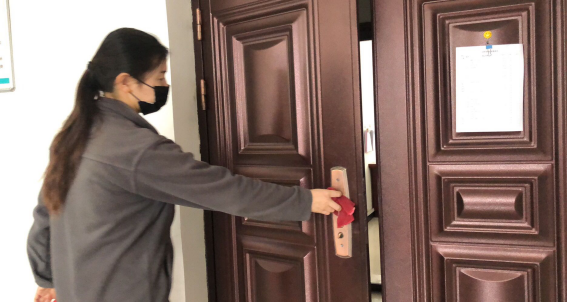 擦拭操作臺(tái)、門把手,工作的有條不紊。