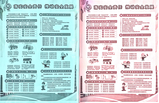 宣傳活動(dòng)周。通過現(xiàn)場懸掛“安全生產(chǎn)月”相關(guān)內(nèi)容的橫幅,張貼標(biāo)語和宣傳畫,設(shè)置公共宣傳欄,組織員工觀看警示教育視頻,營造"安全生產(chǎn)月"活動(dòng)氛圍。緊扣 “落實(shí)安全責(zé)任,推動(dòng)安全發(fā)展”活動(dòng)主題向大家發(fā)放了宣傳安全生產(chǎn)政策法規(guī)、防災(zāi)減災(zāi)宣傳單;現(xiàn)場講解安全科普常識(shí)、機(jī)械傷害知識(shí)及應(yīng)急處置技巧,增強(qiáng)大家的安全生產(chǎn)意識(shí),營造了濃烈的安全生產(chǎn)氛圍。此次安全生產(chǎn)月共計(jì)發(fā)放宣傳資料1100余份,懸掛宣傳橫幅2條,組織員工觀看警示教育視頻8場次,鼓勵(lì)員工參加漫畫制作、征文比賽等相關(guān)活動(dòng)。通過此項(xiàng)活動(dòng),進(jìn)一步強(qiáng)化廣大員工對“紅線意識(shí)”、“底線思維”、“安全發(fā)展理念”等安全生產(chǎn)重要論述的再學(xué)習(xí)和再領(lǐng)會(huì)。