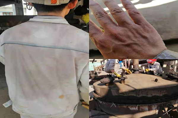 大家都知道轉化現場溫度很高,而且近期外界氣溫已高達三十七八度。轉化現場溫度都接近于45度左右,如同一個大蒸籠,而轉化人員卻每天都在這個大蒸籠里工作;每每投甩完一臺轉化器后,衣服已全部被汗水浸透;到汗珠流到眼睛后,加之與氯化氫氣體接觸,眼睛完全睜不開;在拿掉塑膠手套的那一刻,一雙手被捂的發白發皺;如同在水里浸泡了數小時一樣,但是就在這樣的工作環境下,卻沒有一個人退縮,都在堅守著自己的工作崗位,做出最大的奉獻。