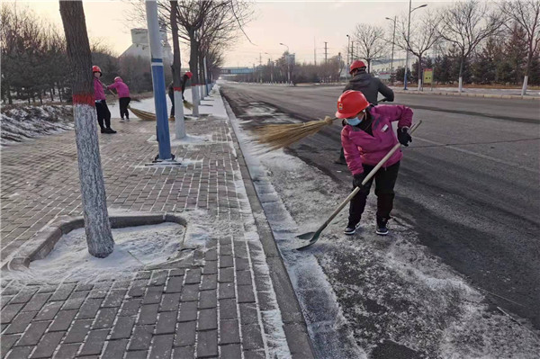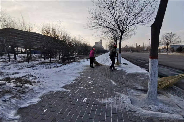 所有日勤人員及下夜班人員都拿著掃把、鐵鍬以及木板開始掃雪。只見巡檢工李丁與吳安寧將木板放到積雪處兩個人使力向前推,積雪瞬間被推起,露出青黑干凈的柏油路面。中控工馬蓉、馬忠蘭等在他們之后用掃把將沒有推干凈的雪一掃而空,路面一下子整潔而干燥,員工們一遍遍重復著剛才的掃雪過程。直至早晨十點,裝置整個所屬區域都恢復原樣,沒有雪的路面雖然沒有了閃耀的美麗,但讓人能安心行走,用長久的安全換取短暫的美麗是一個穩賺不賠的買賣。