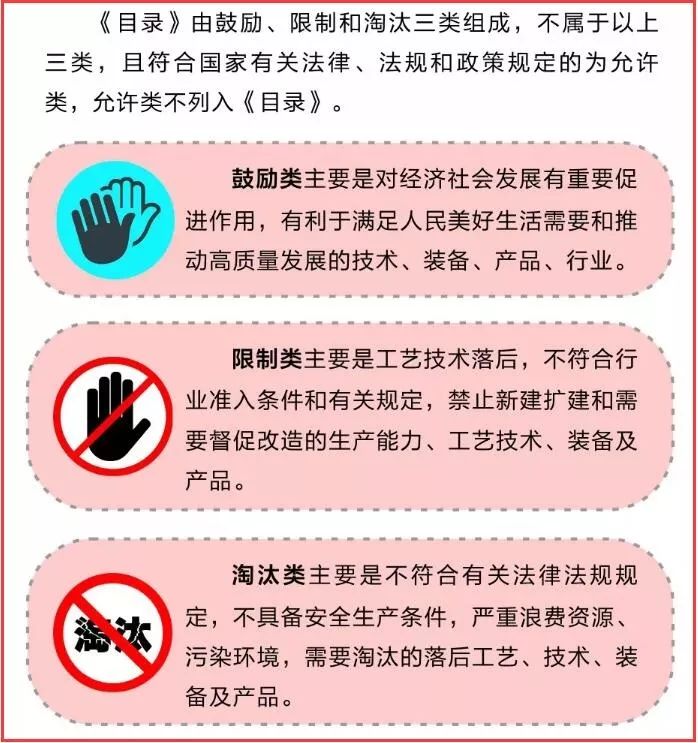 目錄(2019年本)共涉及行業48個,條目1477條,其中鼓勵類821條、限制類215條、淘汰類441條。不屬于以上三類,且符合國家有關法律、法規和政策規定的為允許類,不列入《目錄》。