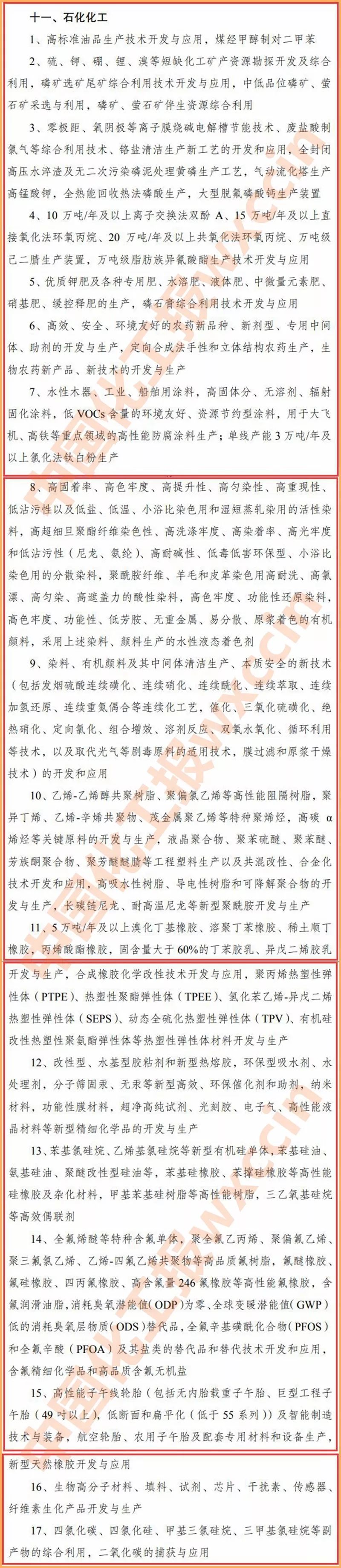石化化工行業鼓勵類有17大類,比征求意見稿少了3大類,包括:高標準油品生產技術開發與應用,煤經甲醇制對二甲苯;硫、鉀、硼、鋰、溴等短缺化工礦產資源勘探開發及綜合利用;零極距、氧陰極等離子膜燒堿電解槽節能技術、廢鹽酸制氯氣等綜合利用技術、鉻鹽清潔生產新工藝的開發和應用;10 萬噸/年及以上離子交換法雙酚 A、15 萬噸/年及以上直接氧化法環氧丙烷、20 萬噸/年及以上共氧化法環氧丙烷、萬噸級己二腈生產裝置;高效、安全、環境友好的農藥新品種、新劑型、專用中間體、助劑的開發與生產;染料、有機顏料及其中間體清潔生產、本質安全的新技術等。