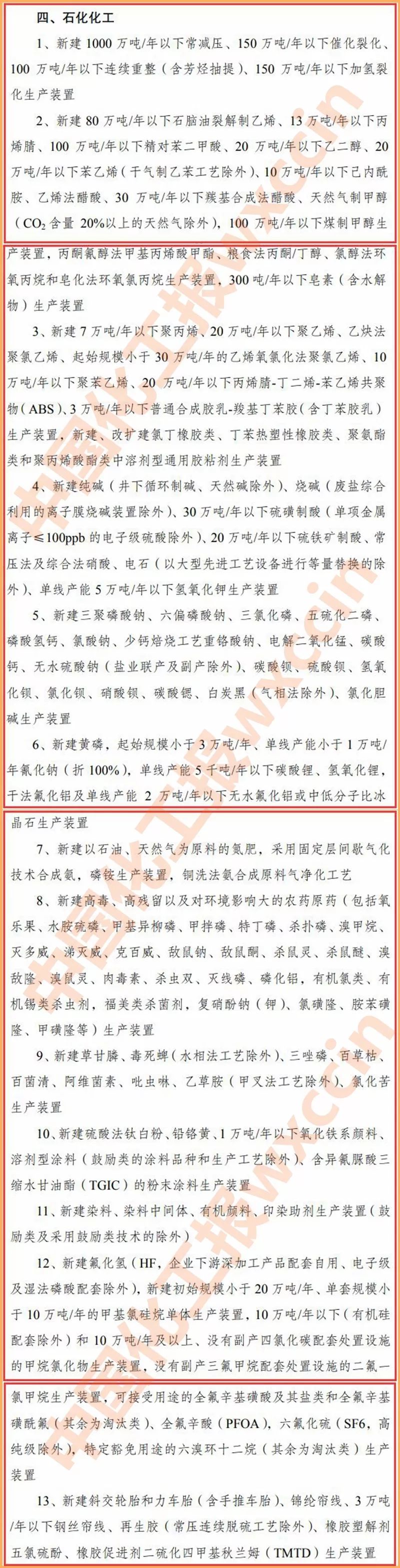石化化工行業限制類有13大類,包括:新建 1000 萬噸/年以下常減壓裝置;新建80萬噸/年以下石腦油裂解制乙烯、13萬噸/年以下丙烯腈、100萬噸/年以下精對苯二甲酸、20 萬噸/年以下乙二醇、20 萬噸/年以下苯乙烯(干氣制乙苯工藝除外);新建純堿(井下循環制堿、天然堿除外)、燒堿、30 萬噸/年以下硫磺制酸、20 萬噸/年以下硫鐵礦制酸、常壓法生產裝置;新建以石油、天然氣為原料的氮肥,采用固定層間歇氣化技術合成氨,磷銨生產裝置,銅洗法氨合成原料氣凈化工藝;新建高毒、高殘留以及對環境影響大的農藥原藥生產裝置;新建草甘膦、毒死蜱(水相法工藝除外)、三唑磷、百草枯、百菌清、阿維菌素、吡蟲啉、乙草胺(甲叉法工藝除外)、氯化苦生產裝置;新建染料、染料中間體、有機顏料、印染助劑生產裝置(鼓勵類及采用鼓勵類技術的除外)等。