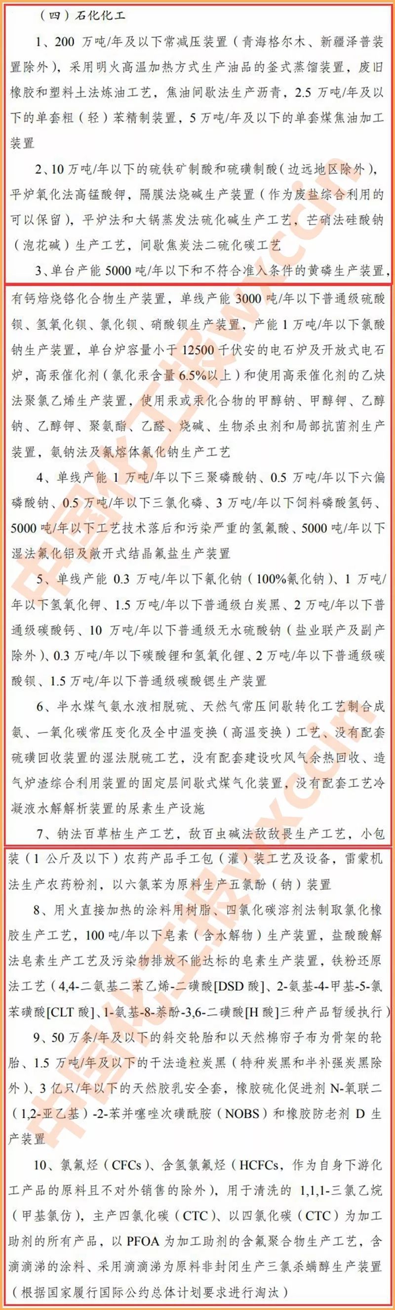 石化化工行業淘汰類有10大類,比征求意見稿少了2大類,包括:200 萬噸/年及以下常減壓裝置,2.5 萬噸/年及以下的單套粗(輕)苯精制裝置,5 萬噸/年及以下的單套煤焦油加工裝置;單臺產能 5000 噸/年以下黃磷生產裝置;半水煤氣氨水液相脫硫、天然氣常壓間歇轉化工藝制合成氨、一氧化碳常壓變化及全中溫變換(高溫變換)工藝、沒有配套硫磺回收裝置的濕法脫硫工藝,沒有配套建設吹風氣余熱回收、造氣爐渣綜合利用裝置的固定層間歇式煤氣化裝置,沒有配套工藝冷凝液水解解析裝置的尿素生產設施;鈉法百草枯生產工藝,敵百蟲堿法敵敵畏生產工藝,雷蒙機法生產農藥粉劑,以六氯苯為原料生產五氯酚(鈉)裝置等。