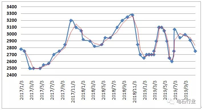 2019年電石市場波動不同于2018年,價格出現了連續快速的波動,漲跌幾乎無任何喘息時間,主要受到供需持續波動的影響。前半年經歷大幅漲跌,上漲時連續大漲,漲幅超過600元/噸,下跌時快速下移,降幅跌破成本線后再度下行400元/噸,回吐了全部漲幅;三季度電石價格呈現“N”字型走勢,先漲后跌再漲,變化幅度略小于上半年:7月價格前漲后穩月底局部小幅下調,多數時間慣性上漲200-300元/噸,隨后月底局部價格下調50元/噸左右;8月份價格下行200-300元/噸,回吐前期漲幅;9月份價格再度反彈,至月底已反彈了150-250元/噸不等;10月電石價格再次極速下滑300元/噸,1-10月電石價格呈現“M”字型,回落到當前主流價格的2550-2650元/噸。