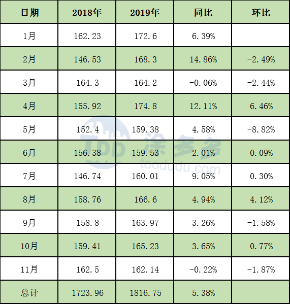 2019年1-11月PVC累計產量1816.75萬噸,同比去年減少92.79噸。漲幅5.38%,產能的凈增是產量增加的主要原因。