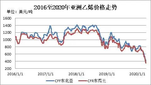 在需求增長和美國頁巖氣革命的推動下,近年來,全球乙烯行業進入新一輪擴能高峰期,供應趨向寬松,乙烯市場運行中樞下移。油價暴跌,乙烯的成本端支撐塌陷,乙烯市場加速下跌,乙烯法PVC的生產成本進一步下降。截至2020年4月上旬,亞洲乙烯CFR東北亞報405至415美元/噸,較年初下跌逾40%。全球VCM市場供需相對平衡,價格波動幅度較小。2018年至2020年初,亞洲乙烯CFR東北亞價格大體在650-800美元/噸之間震蕩。受油價下跌影響,VCM價格大跌,2020年4月上旬,亞洲乙烯CFR東北亞報423-425美元/噸,較年初下跌近40%。