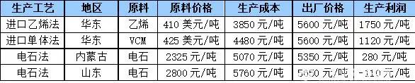 表1 2020年4月上旬PVC生產成本及利潤測算