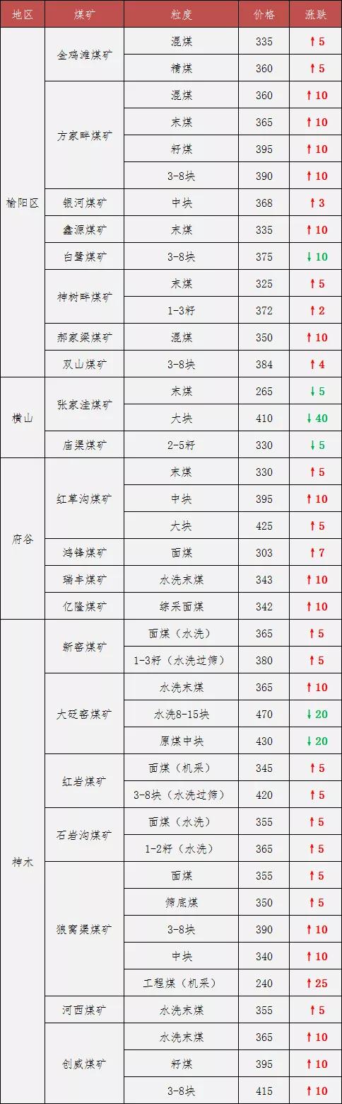 榆林煤價繼續(xù)漲:18家煤礦上調(diào)價格5-10元/噸 周末至今,榆林18家煤礦又上調(diào)價格。據(jù)榆林煤炭交易中心數(shù)據(jù)顯示,截止目前,榆陽區(qū)(6000k 0.6S)動力煤均價為357元/噸,環(huán)比上漲6元/噸;神木(5800k 0.4S)動力煤均價為339元/噸,環(huán)比上漲5元/噸;府谷(5500K 0.4S)動力煤均價為322元/噸,環(huán)比上漲7元/噸。 最新調(diào)價煤礦: