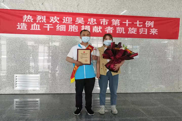 5月12日,劉治成返回吳忠,集團公司黨委副書記王立軍、支部書記唐亮等領導,熱烈迎接這位造血干細胞捐獻者獻凱旋歸來。