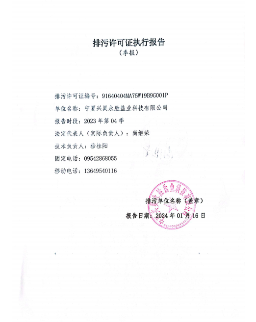 寧夏興昊永勝鹽業科技有限公司2023年第4季度排污許可執行報告