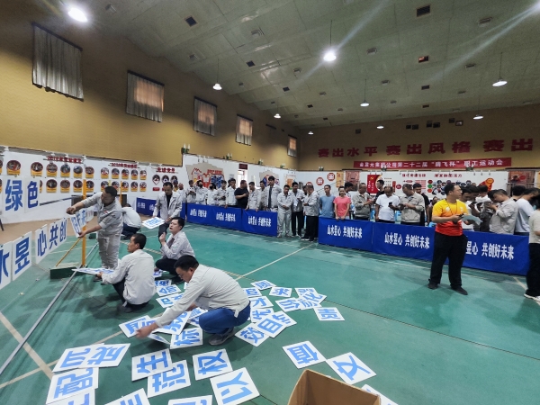 隨著裁判一聲令下,企業(yè)理念拼字比賽迎來激動人心的時刻。各參賽隊員不急不躁、有條不紊,大家集思廣益、默契配合,在最短時間內(nèi)準確拼出“踐行綠色發(fā)展 留駐青山綠水”“山水昱心 共創(chuàng)好未來”“安全就是幸福 安全就是效益”等橫幅。